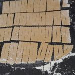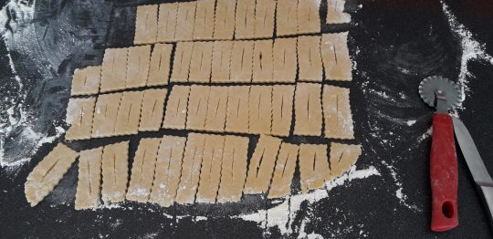 Découper des bandes de 3 cm de large avec une roulette à pâtisserie (ça marche avec la roulette à pizza). Redécouper les bandes pour former des rectangles de 4 ou 5 cm, pour obtenir des beignets rectangulaires. Les fendre au milieu avec la roulette sur 1 ou 2 cm.