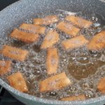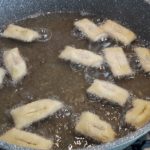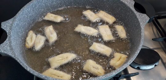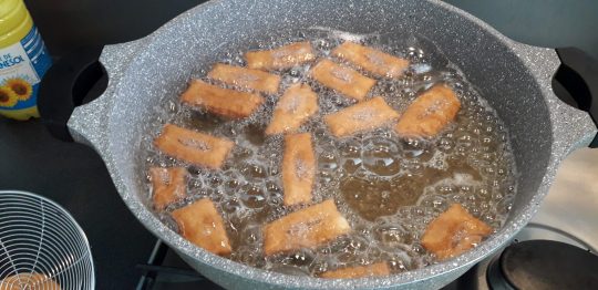 Faire chauffer l’huile dans une sauteuse assez haute. Y mettre les crostoli par petites quantités. Les laisser dorer sur un côté puis les retourner à l’aide d’une fourchette pour qu’ils dorent de l’autre côté.