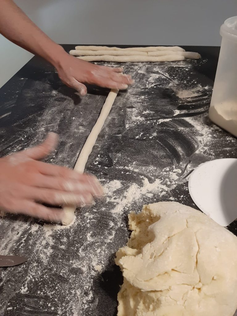Prélever un morceau de cette pâte et former un boudin en roulant le morceau de pâte sur le plan de travail fariné.